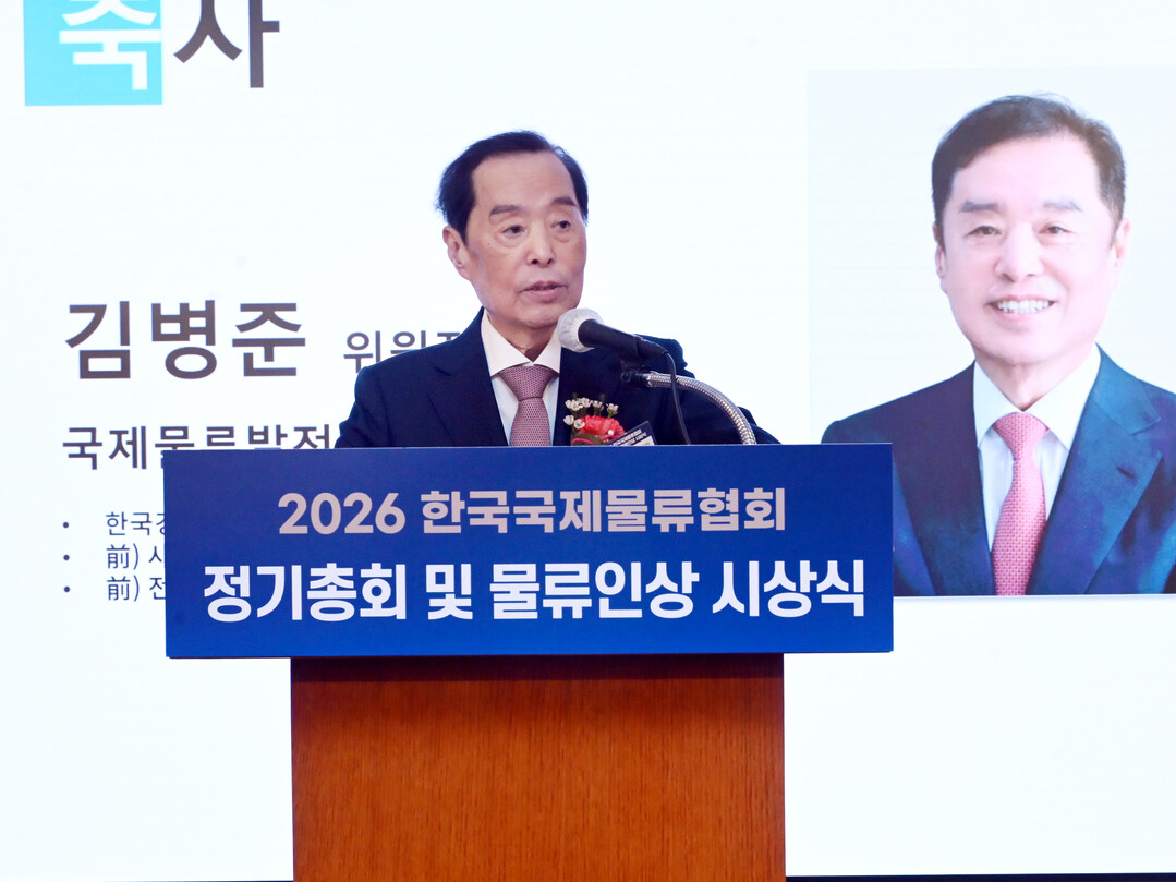 한국국제물류협회는 25일 오전, 서울 롯데호텔 사파이어볼룸에서 ‘2026 한국국제물류협회 정기총회 및 물류인상 시상식’을 개최했다. 김병준 국제물류발전자문위원회 위원장이 축사를 하고 있다.