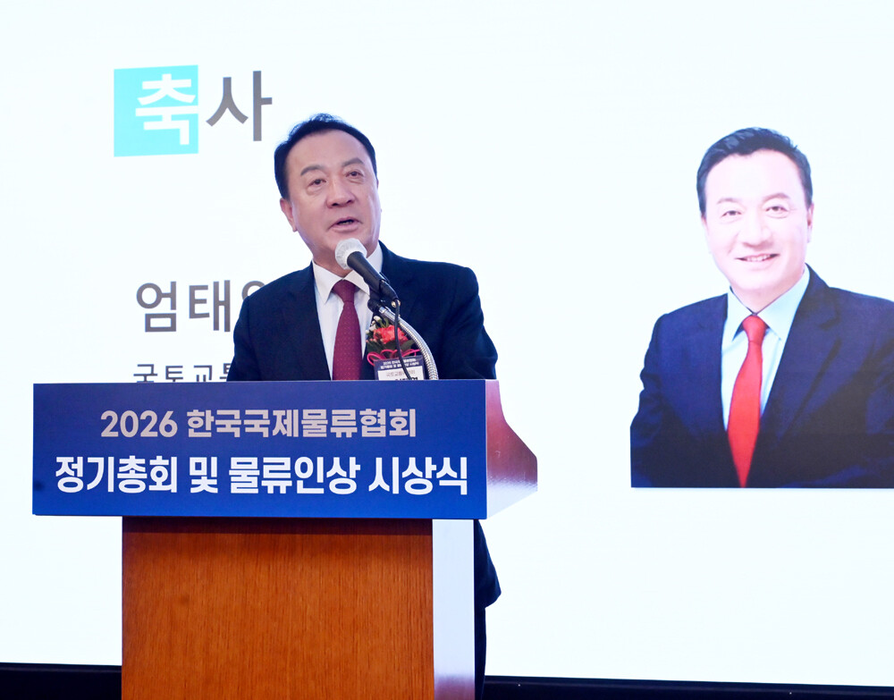 한국국제물류협회는 25일 오전, 서울 롯데호텔 사파이어볼룸에서 ‘2026 한국국제물류협회 정기총회 및 물류인상 시상식’을 개최했다. 엄태영 국토교통위원회 위원이 축사를 하고 있다.