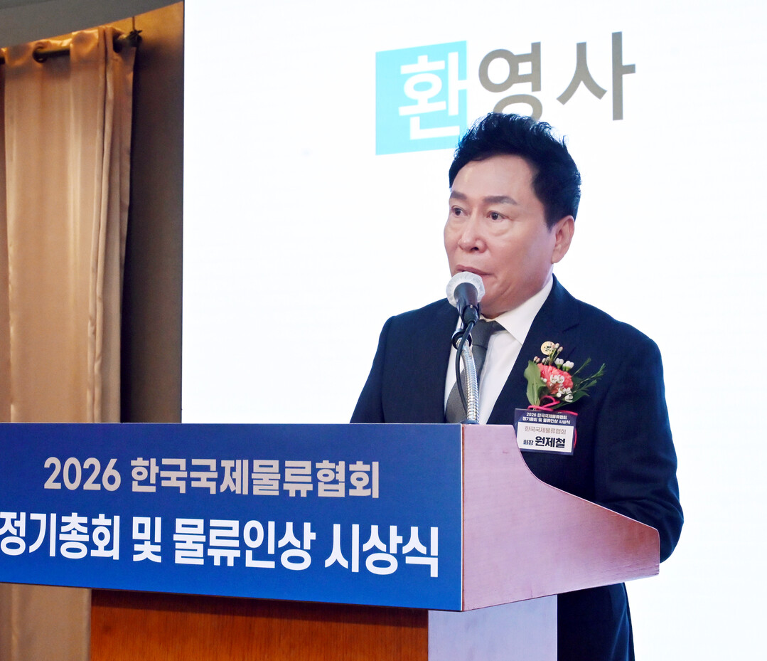 한국국제물류협회는 25일 오전, 서울 롯데호텔 사파이어볼룸에서 ‘2026 한국국제물류협회 정기총회 및 물류인상 시상식’을 개최했다. KIFFA 원제철 회장이 환영사를 하고 있다.