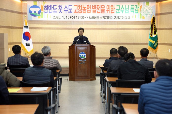 16일 고창군에 따르면 지난 15일 오후 고창군농업기술센터 대강당에서 유기상 고창군수가 지역 농업경영인 60여 명을 대상으로 한 역량강화 교육에 참가해 2시간 가량 특강을 펼쳤다.
