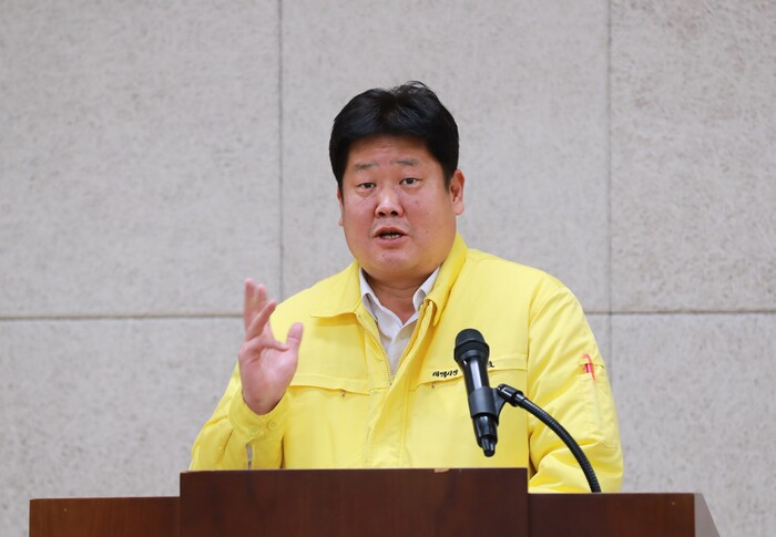 ▲이상호 태백시장이 지난 25일 열린 ‘함께하는 태백시 적극행정·혁신행정 사업(특례)발굴 해커톤 대회’에서 인사말을 하고 있다. 태백시 제공 |