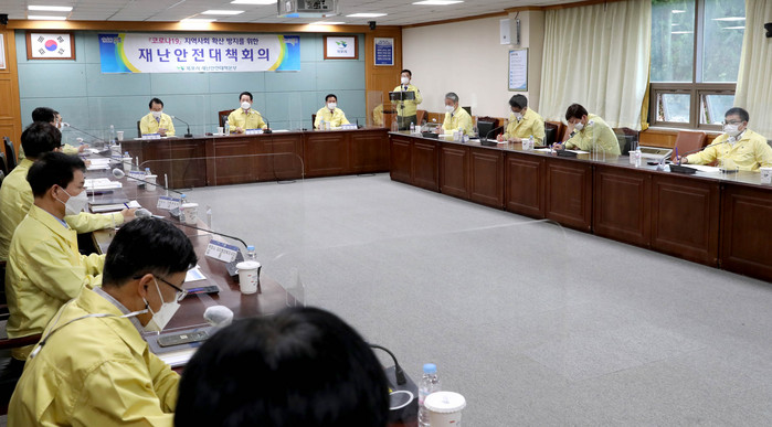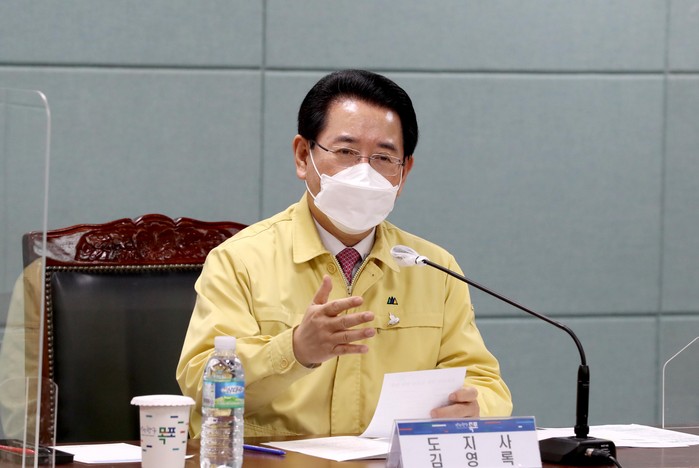 ▲김영록 지사가 21일 목포 코로나19 감염증 대응 현장을 방문해 회의를 주재하고 있다.(전남도 제공) |