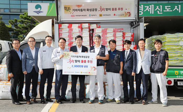 | ▲기아자동차 화성공장 임직원 봉사단이 평택시를 방문해 추석맞이 물품을 전달했다.(사진제공=평택시) |