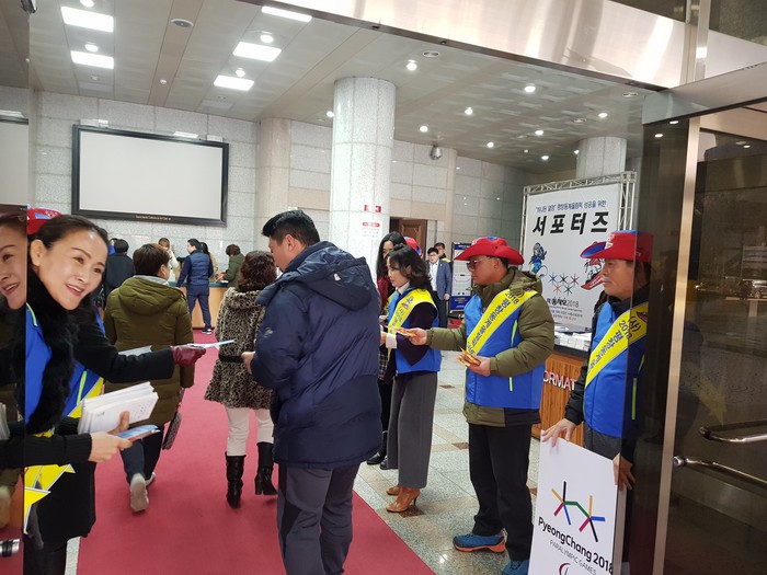 ▲평창동계올림픽 서포터즈 동사모2018 삼척지회 회원들이 교육장에 들어서는 영업주들에게 올림픽 홍보물을 건네주고 있다. |