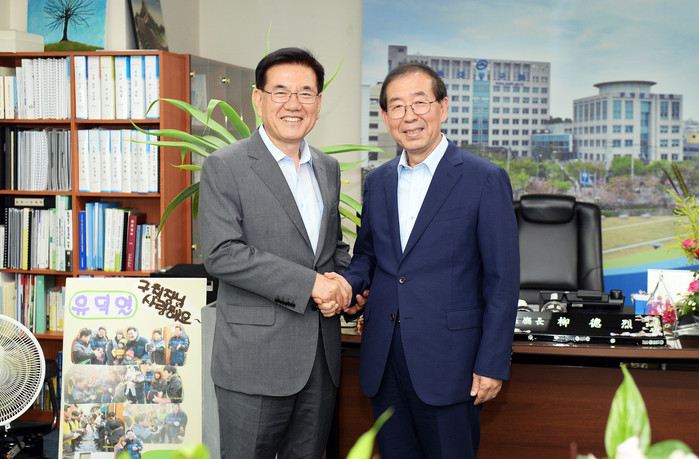 박원순 서울시장과 유덕열 동대문구청장은 먼저 구청장실에서 차담을 나누고 ▲전농7구역 학교부지 기능 정상화 ▲장안동 화물터미널 부지 도시계획 시설 변경 ▲배봉산 주변 저층주거지 최고 고도지구 해제(완화) 등에 대해 논의했다.