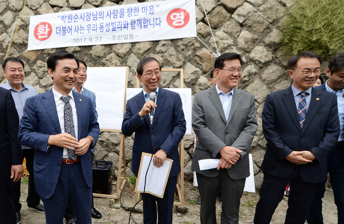 ▲배봉산 주변 저층주거지 현장에서 주민과 대화하는 박원순 시장, 유덕열 구청장. |