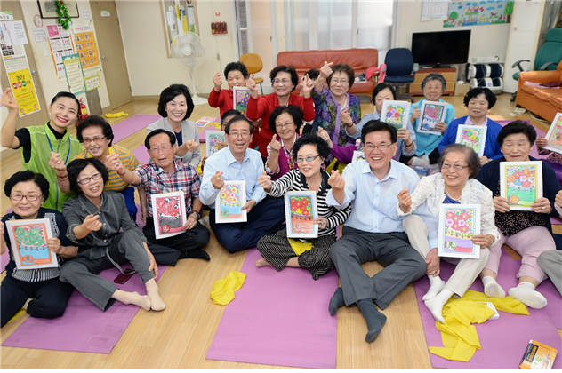 ▲박원순 서울시장(앞줄 왼쪽 네 번째)은 27일 오후 동대문구를 방문했다. 박원순 시장이 답십리3동 경로당을 찾아 유덕열 동대문구청장(여섯 번째) 및 어르신들과 기념촬영을 하고 있다(사진 속 그림은 어르신들이 직접 그린 작품) |