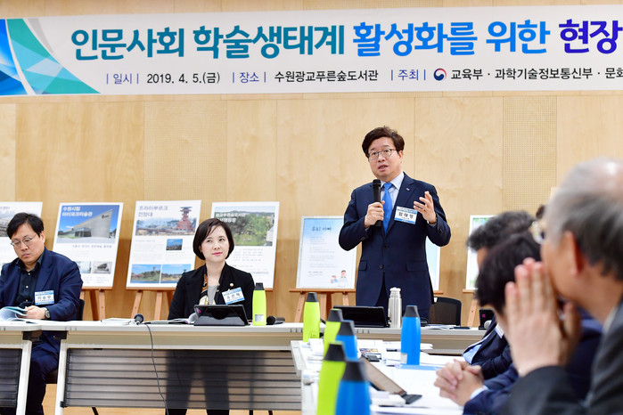 유은혜 교육부 장관은 5일 수원 광교푸른숲도서관에서 과학기술정보통신부‧문화체육관광부, 수원시 관계자와 인문사회 학술생태계 활성화를 위한 현장 간담회를 열었다.