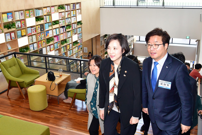 | ▲염태영 시장과 유은혜 부총리가 광교푸른숲도서관을 둘러보고 있다.(수원시 제공) |
