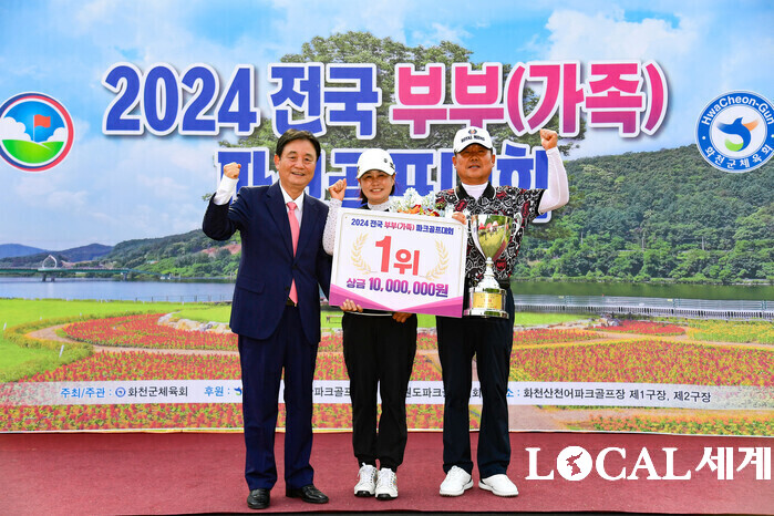 ▲ 지난 14일 화천군 하남면 거례리 산천어 파크골프장에서 열린 2024 전국 부부(가족) 파크골프대회 시상식에서 우승을 차지한 홍종화, 조인순씨 부부가 최문순 화천군수와 함께 트로피를 들고 기념촬영을 하고 있다 |