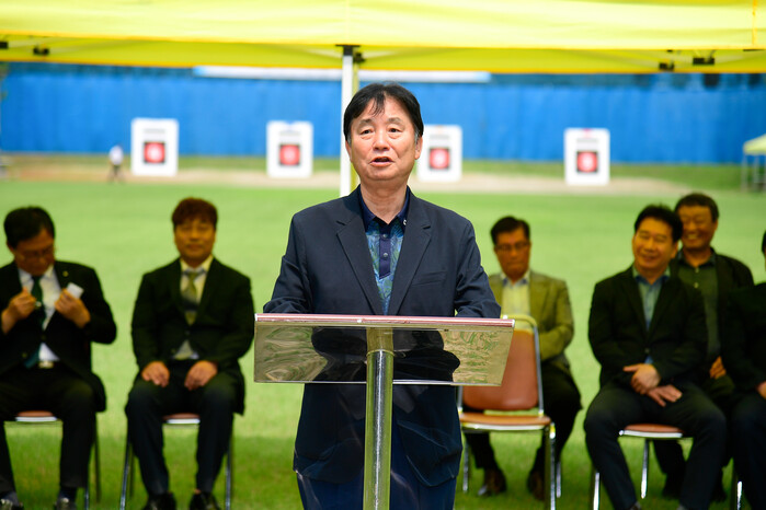 ▲최문순 군수가 제7회 화천군수기 강원특별자치도 남녀 궁도대회에서 환영사를 하고 있다. |