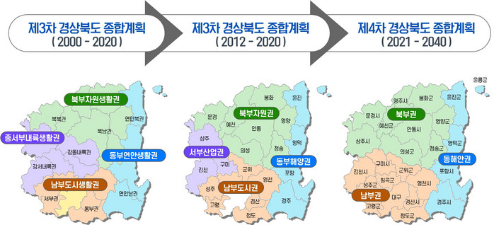 새롭게 마련된 공간구상은 제5차 국토종합계획과의 정합성을 유지하되, 국토균형발전 실현을 위한 초광역협력을 지향하는 권역으로 설정했으며(남부권, 북부권, 동해안권), 더나아가 시간경제권별 인프라 연결망 확충에 중점을 두고 경상북도의 발전을 이끌어 나간다는 방침이다.