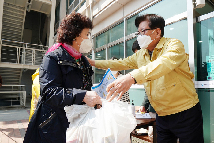 유 구청장은 식료품을 받기 위해 복지관을 찾은 주민들에게 안부를 묻고 코로나19 예방수칙을 준수해 줄 것을 부탁했다.