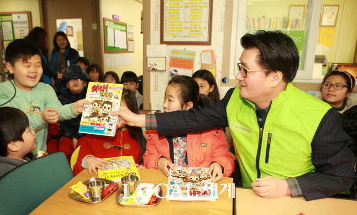 ▲ 22일 유종필(오른쪽) 관악구청장이 지역 아동들에게 책을 나눠주고 있다.© 로컬세계 |