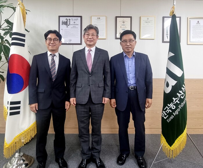 ▲ 한국농수산식품유통공사 김춘진 사장, ㈜일화 김윤진 부사장, 정진출 해외사업본부장(오른쪽부터) / aT 제공 |