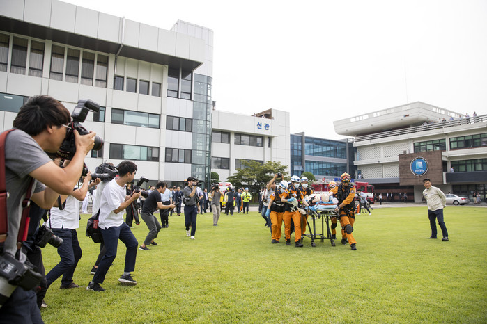 공공청사를 활용한 소방과 응급의료전용헬기 항공의료팀 간 협력 태세를 평가하고자 마련된 이날 훈련은 ‘긴급 구조.구급작전’이라는 가상 상황 하에 실시됐다.