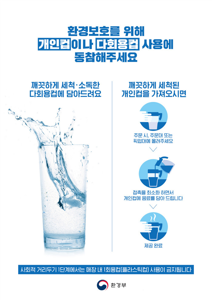 개편된 사회적 거리두기 1단계에서는 1회용품 사용규제로서 업소에서는 충분히 세척·소독한 다회용 컵을 사용하여야 하며, 이용자가 깨끗하게 세척된 개인컵을 사용할 시에는 접촉을 최소화하면서 서비스를 제공하여야 한다.