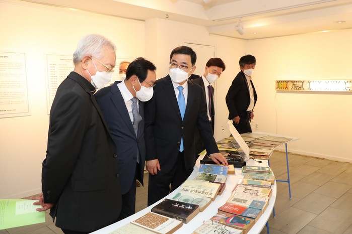 ▲허성무 시장(왼쪽에서 세번째)이 '부마민주항쟁 역사기록전, 민주의 귀환' 전시장을 둘러 보고 있다. 창원시 제공 |