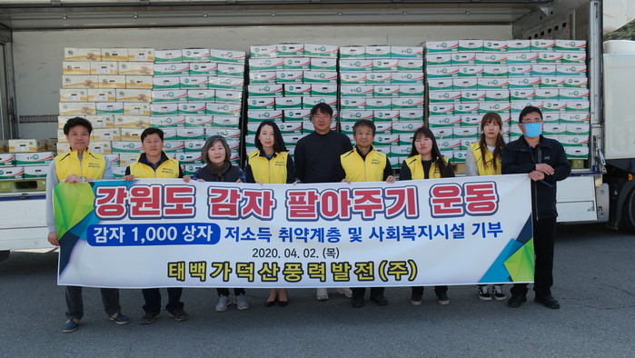이는 태백가덕산풍력발전은 최근 ‘강원도 감자 팔아주기’에 동참해 구입한 1000상자 중 일부이다. 나머지는 강원도사회복지협의회를 통해 도내 취약계층에게 전달 될 예정이다.