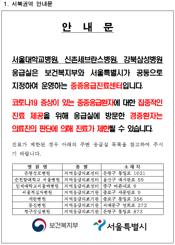 서울시는 혹시라도 경증환자의 진입이 제한될 수 있어, 이를 사전에 방지하기 위해 경증환자는 인근 ‘지역응급의료센터’, 또는 ‘지역응급의료기관’으로 방문하도록 안내하고 있다.