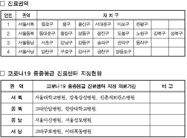 ‘서울시 코로나19 중증응급진료센터’는 감염관리 및 진료능력이 우수한 권역응급의료센터와 상급종합병원을 중심으로 △서북권역은 서울대학교병원, 신촌세브란스병원, 강북삼성병원 △동북권역은 고대안암병원, 한양대학교병원 △동남권역은 서울아산병원, 서울성모병원 △서남권역은 고대구로병원, 이대목동병원을 지정, 운영한다.