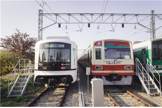 ▲차량기지에서 대기 중인 2호선 신형 전동차(좌)와 1호선 구형 전동차(우) |