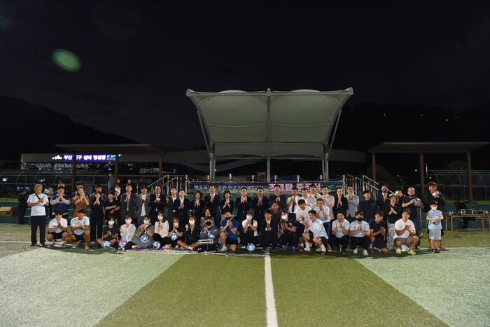 [로컬세계 부산=맹화찬 기자]부산 남구는 민선8기 공약사업 중 하나인 생활체육인 야간이용 시설 확충을 위한 추진사항의 일환으로 백운포체육공원 인조잔디제2축구장 조명탑을 설치하고 그 준공식을 지난 26일 오후 7시 백운포체육공원에서 개최했다.