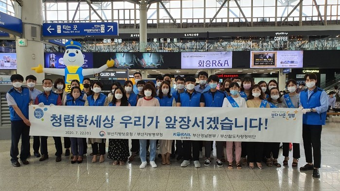 [로컬세계 맹화찬 기자]코레일 부산경남본부(본부장 김기태)는 22일 오후 2시 부산역 맞이방에서 열차 이용고객을 대상으로 청렴문화 확산을 위한 지역 유관기관 공동 캠페인을 시행했다고 전했다.