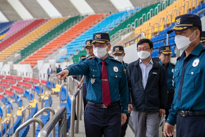 ▲우철문 부산경찰청장은 6일 '2030 부산세계박람회 유치 기원 콘서트 BTS 인 부산' 개최 예정지인 아시아드주경기장 일대를 두 번째 방문, 만일의 사태에 대비한 현장점검을 재차 실시하고 있다. 부산경찰청 제공 |