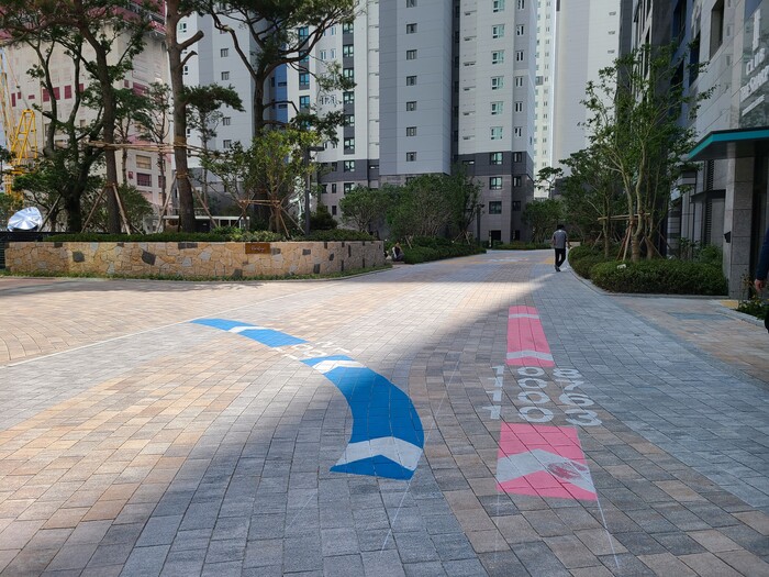 ▲ 부산 남부소방서는 공동주택 내 재난시 소방차량의 신속한 도착과 원활한 활동을 위해 남천더샵프레스티지아파트 단지내 소방차 유도선을 설치했다. 남부소방서 제공 |