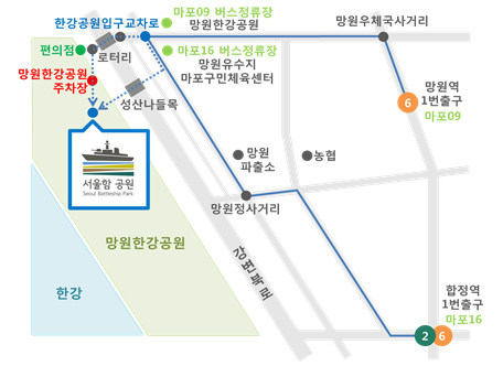 망원한강공원에 위치한 서울함공원은 호위함급 ‘서울함’, 고속정 ‘참수리호’, 잠수정 ‘돌고래호’ 총 3척의 퇴역군함을 관람할 수 있는 곳으로 한강의 역사적 의미, 평화와 안보의 의미를 체험할 수 있는 새로운 문화공간이다.