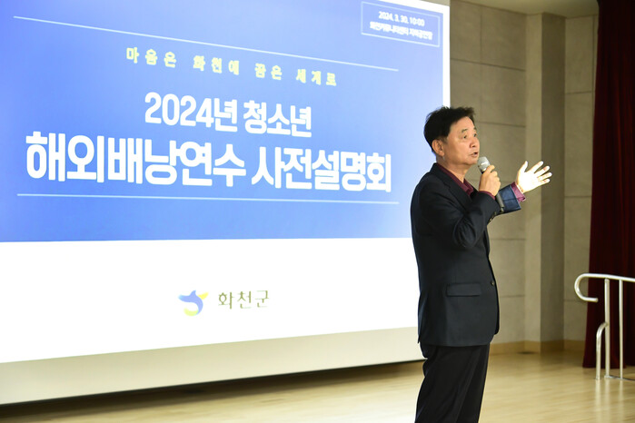 [로컬세계=전경해 기자]강원 화천군이 지역인재들의 견문을 넓혀주기 위해 올해도 청소년 해외 배낭연수 사업을 시행한다. 전액 무상으로 진행되는 해외 배낭 연수는 청소년들이 방문 국가 확정 등 사전계획은 물론, 현지에서의 일정까지 모두 스스로 정해 운영되는 프로그램이다. 군은 지난 30일 화천커뮤니티센터 공연장에서 학생과 학부모들을 대상으로‘2024 청소년 해외배낭연수 사전 설명회’를 개최하고, 올해 사업계획을 밝혔다.