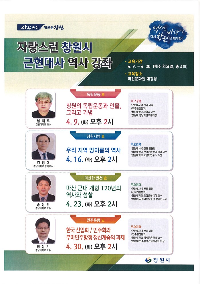‘기미년 독립운동 100주년’, ‘마산항 개항 120주년’, ‘부마민주항쟁 40주년’을 맞아 시민 자긍심 고취와 올바른 역사의식 제고를 위해 마련된 이번 강좌는, 9일부터 오는 4월 30일까지 매주 화요일 오후 2시 마산문화원에서 총 4회 강의로 진행된다.