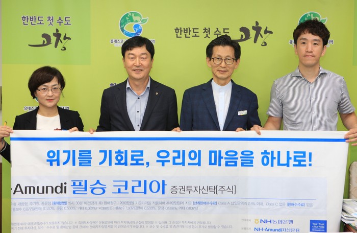 유 군수는 지난 3일 농협은행 고창군청지부를 찾아 지점장으로부터 펀드의 개요와 취지 등에 대한 설명을 듣고 ‘NH-Amundi 필승코리아 주식형 펀드’에 가입했다.