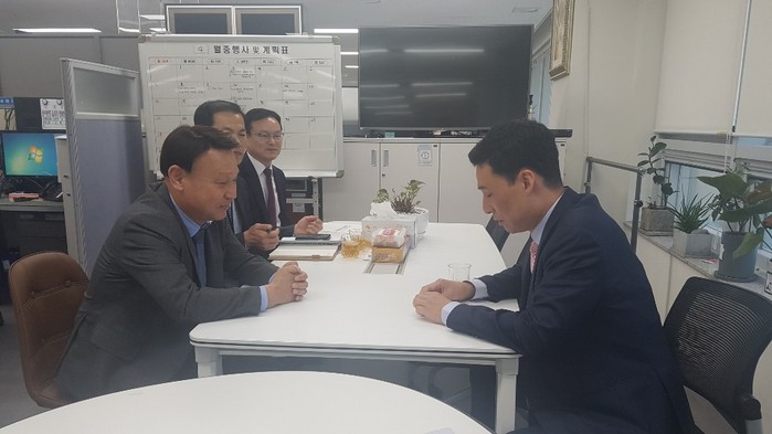 ▲강임준 군산시장(가운데)이 16일 과기부 전성배 기획조정실장과 면담하고 있다. |