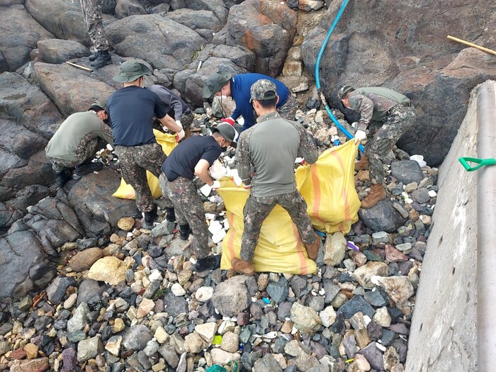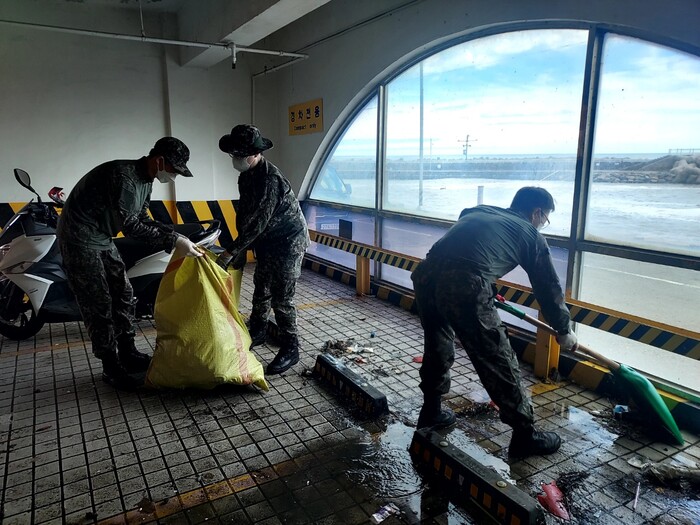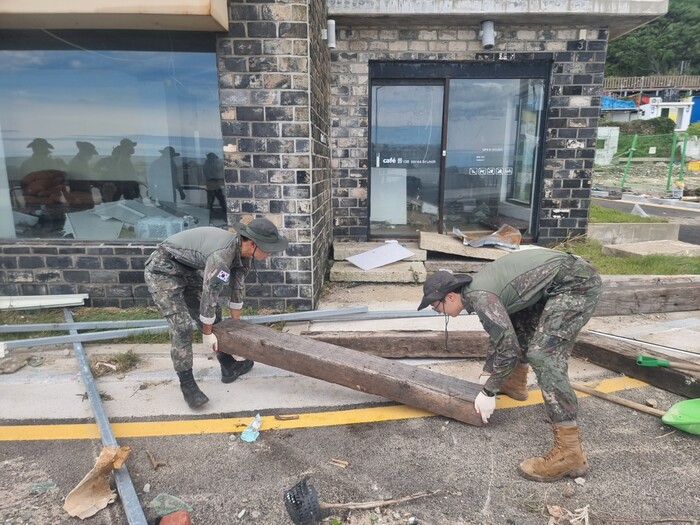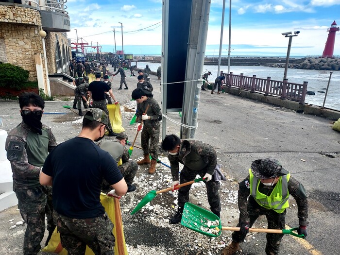 53사단 장병들이 6일부터 해운대 청사포 일대에서 태풍 힌남노 피해 대민지원을하고 있으며 앞으로 계속 피해지역에 대민지원을 한다고 했다.(사진=53사단 제공)