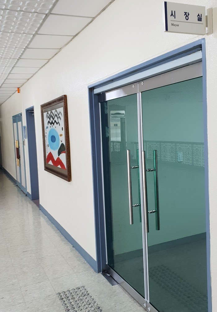 그동안 목재출입문은 청사를 방문한 인허가 관계자나 각종 방문 민원인이 밖에서 사무실을 볼 수 없어 단절감과 거리감, 폐쇄감을 주고 있다는 지적을 받았다.