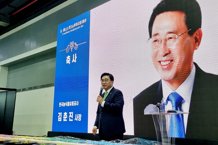 ▲ K-웰니스 푸드&투어리즘 페어 현장 사진. 축사하는 한국농수산식품유통공사 김춘진 사장 |