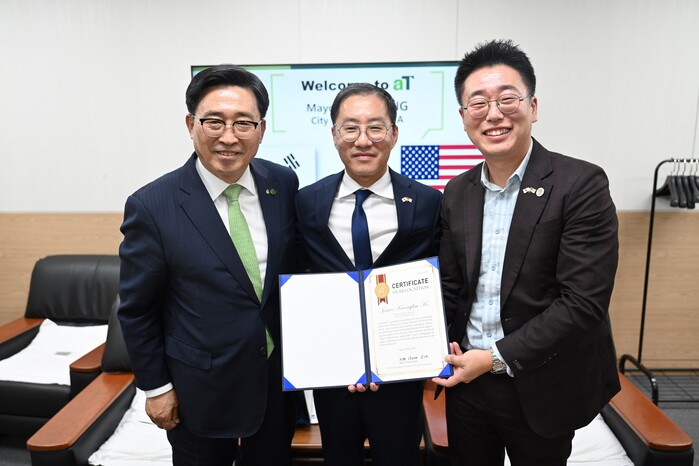 ▲ 감사장 수여식 현장 사진. 한국농수산식품유통공사 김춘진 사장(좌측1번째), 미국 풀러턴시 프레드 정(Fred Jung) 시장(가운데), 미국 풀러턴시 고광림 정책고문(우측1번째) |