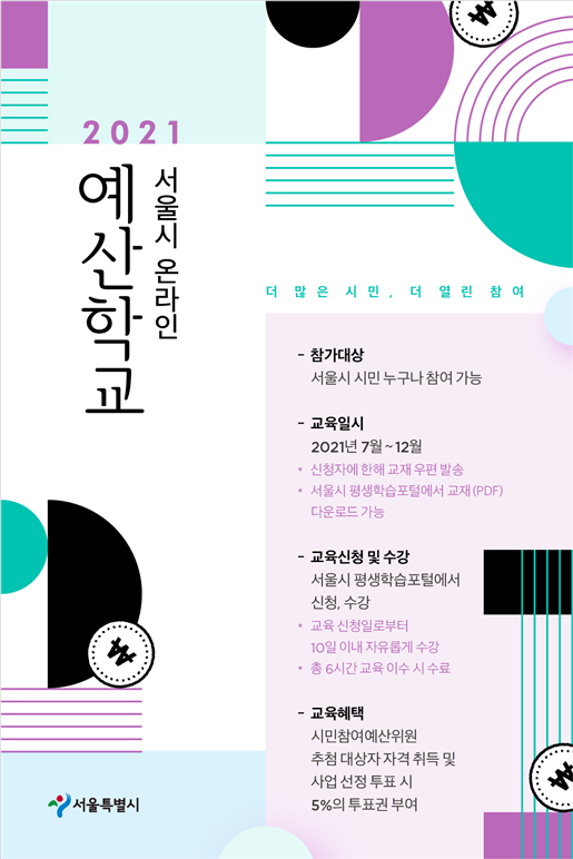 [로컬세계 이명호 기자]서울시는 시민들이 능동적으로 시민 참여예산에 함께 할 수 있도록 역량을 강화하기 위해 매년 ‘예산 학교’를 운영하고 있다. 올해는 코로나19로 인해 예산 학교 온라인 과정을 개설하고 수강생을 모집한다.