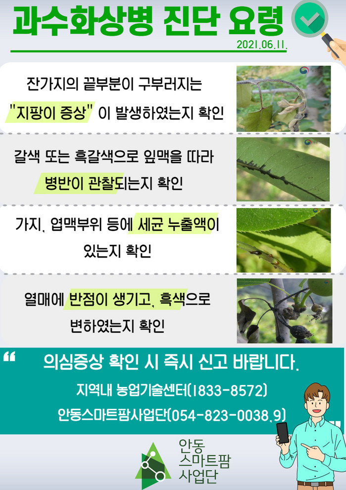 그동안 안동스마트팜사업단은 안동시에 과수화상병이 발생한 이후 지금까지 지속적으로 농가에 과수화상병 예방 방법, 의심 증상 발생 시 조치 요령 등의 내용을 담은 문자를 발송하였으며, 과수화상병 발생 집중 시기에는 1일 2회씩 예방 안내 문자를 발송하여 확산 방지에 힘썼다.