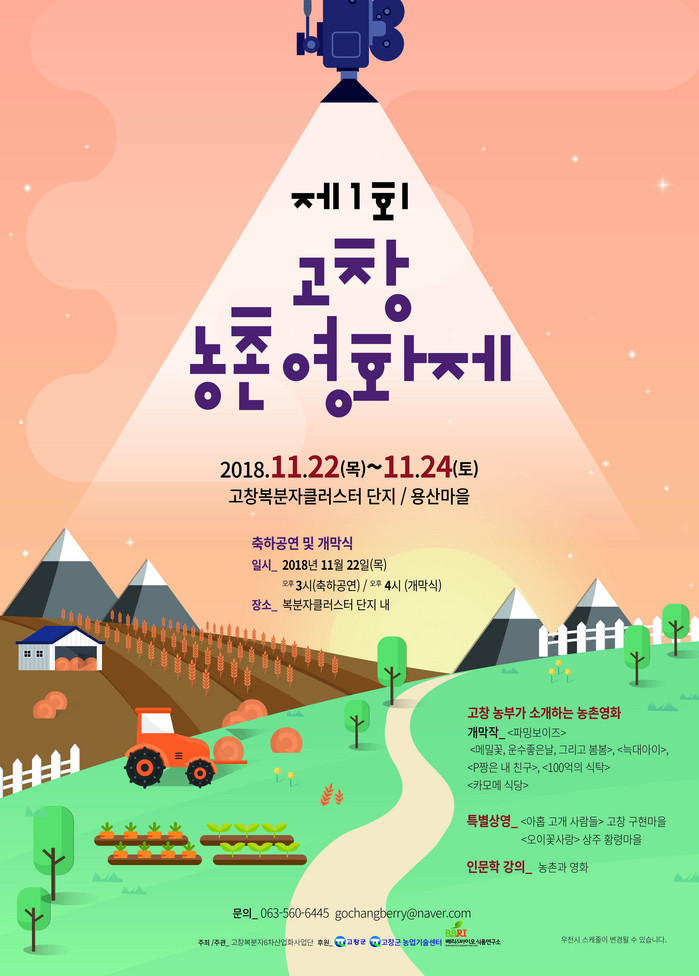 전북 고창군은 이달 22~24일까지 사흘간 부안면 복분자클러스터에서 ‘제1회 고창 농촌영화제’를 개최한다고 14일 밝혔다.