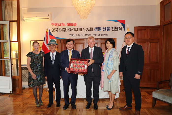 이날 오후 2시 권영세 안동시장, 배준호 농협안동시지부장, 권순협 안동농협조합장 등은 주한 영국대사관을 예방해 사이먼 스미스 영국 대사에게 안동사과와 고구마를 전달하며 생일 선물 전달식을 가졌다. 이 사과는 오는 12일 영국 여왕의 생일 축하선물로 버킹엄 궁에 전해질 예정이다.