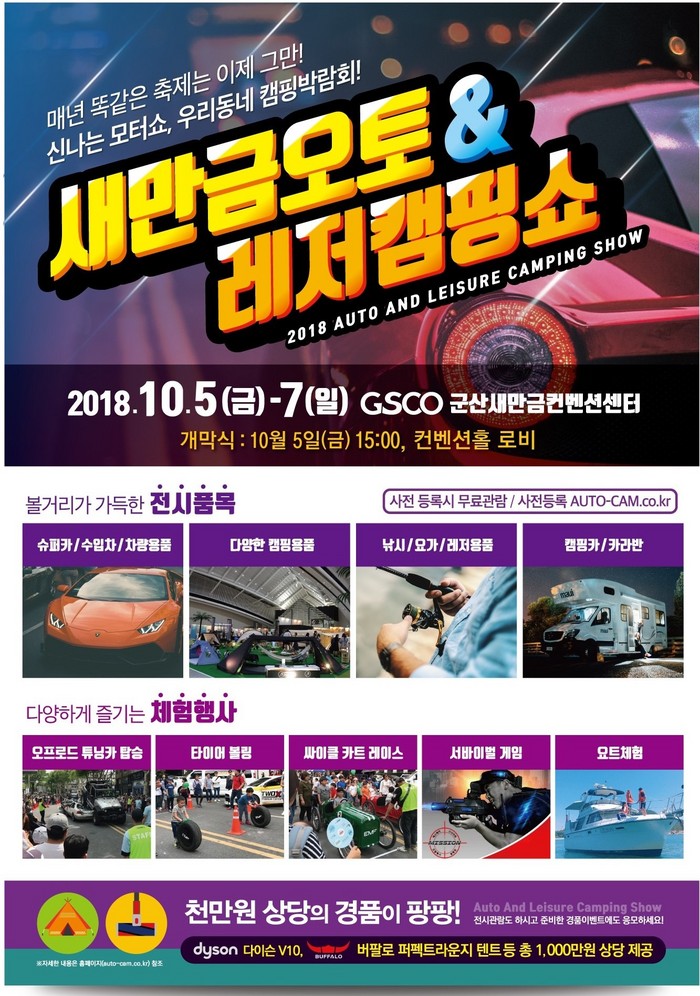 ‘새만금오토&레저캠핑쇼’는 1인 캠핑용품, 반려동물 캠핑용품, 중장년층을 타깃으로 한 캠핑카와 카라반 등 세대별 라이프 스타일에 맞는 다양한 캠핑장비와 레저용품을 선보일 예정이다.