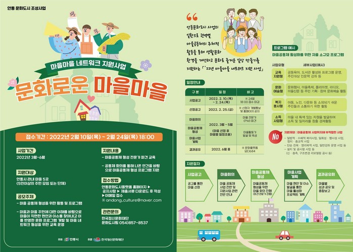 [로컬세계 이창재 기자]한국정신문화재단은 안동 문화도시 조성사업의 일환으로 권역별 마을 공동체 활성화를 통해 마을문화 환경을 개선하고 문화로 즐거운 일상 만들기를 지원하는 『마을마을 네트워크 지원사업 ‘문화로운 마을마을’』참여 마을을 모집한다.