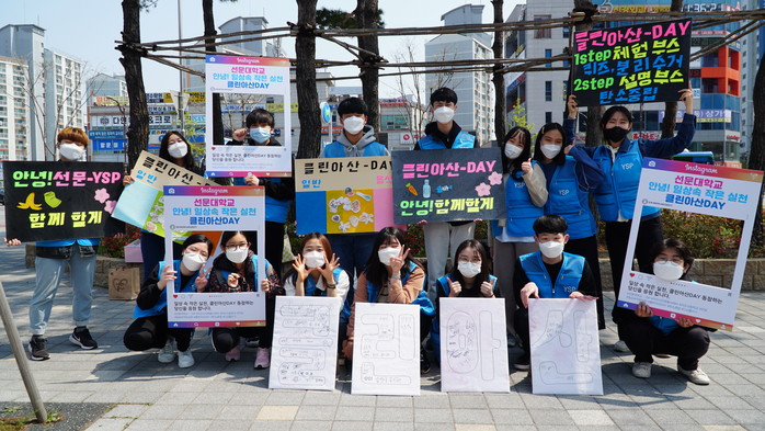 ▲10일 충남아산시에서 YSP,선문대,아산고 자원봉사 청년들이 생활방역・환경정화 활동 중간에 기념촬영을 하고 있다. |
