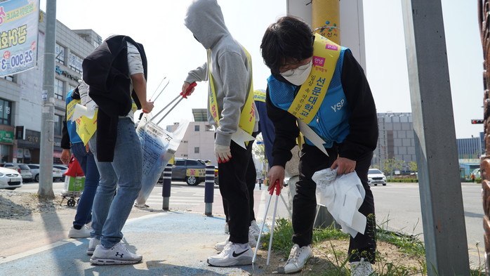 ▲10일 충남아산시에서 YSP 자원봉사 청년들이 환경정화 활동을 하고 있다. |