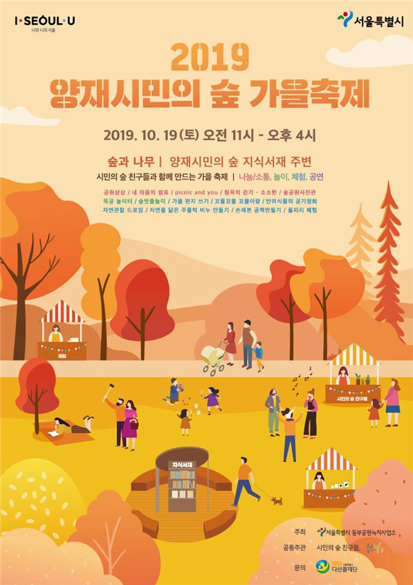 ‘2019 양재 시민의숲 가을축제 ’에 대한 자세한 사항은 ‘서울의 산과 공원’ 홈페이지(http://parks.seoul.go.kr)에서 확인할 수 있다.