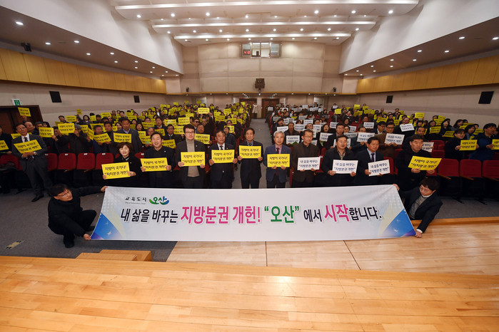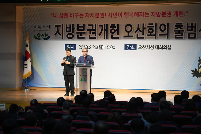 오산시가 주최하고 오산시자치분권협의회가 주관한 이번 출범식에는 곽상욱 오산시장, 손정환 오산시 의장을 포함한 오산시의원, 오산회의에 동참한 관내 103개 시민·사회단체 등 총 300여 명이 참석해 지방분권개헌을 촉구했다.