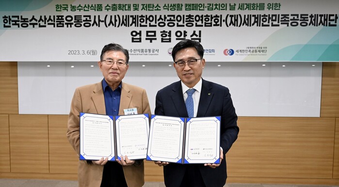 한국농수산식품유통공사(사장 김춘진)는 (사)세계한인상공인총연합회, (재)평화와 번영을 위한 세계한민족공동체재단과 6일 서울 aT센터에서 K-푸드 수출 확대를 비롯해 전 세계 탄소중립 생활 실천과 김치의 날 제정을 통한 한식 세계화에 함께 하고자 업무협약을 체결했다.